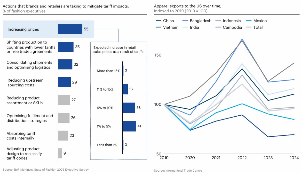 ・供應商的積極應對:為了維持生計,大型供應商正在擴大客戶群、重新談判合約,甚至轉向生產更高或更低價值的產品。例如,印度製造商Gokaldas Exports正將其生產基地擴展至肯亞和衣索比亞,以平衡關稅風險,確保成本競爭力。(左)面對高關稅,品牌預計採取的措施。Source: BoF-McKinsey State of Fashion 2026 Executive Survey (右)2019-2024年各國服裝出口美國的消長。Source: International Trade Centre