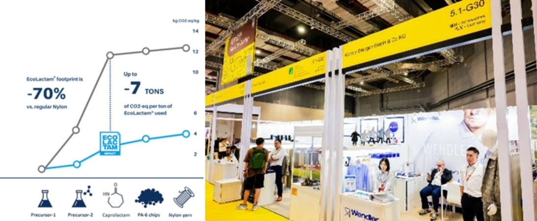 成立於1952年,是可持續尼龍解決方案的先驅,現隸屬全球最大的己內醯胺(Caprolactam)和硫酸銨(Ammonium sulfate)生產商——中國恒申集團。專注於高性能合成纖維與低碳材料開發,於本屆展會展示了其EcoLactam® 可持續尼龍6原料。該產品採用生質碳源,並透過節能製程減少溫室氣體排放,使新一代環保材料達到世界級的碳足跡水準。為全球功能性服飾與工業紡織應用帶來更環保的選擇。