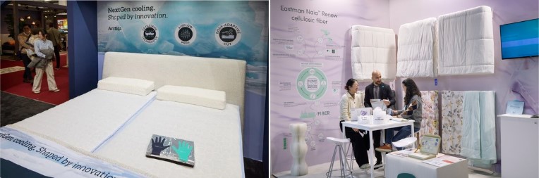智慧寢具與纖維紗線展區。左圖:結合涼感機能與透氣結構的床墊,解決睡眠悶熱痛點。右圖:再生纖維素纖維,從源頭循環製程到終端寢具的永續應用。Photos by Messe Frankfurt GmbH / Jean-Luc Valentin.