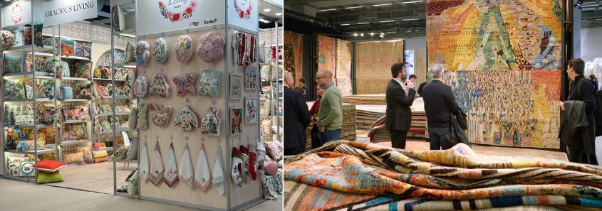 左圖:刺繡抱枕為居家裝飾重點;右圖:藝術圖騰與精細織造的大型地毯。Photos by Fashion Express & Messe Frankfurt GmbH / Jean-Luc Valentin.