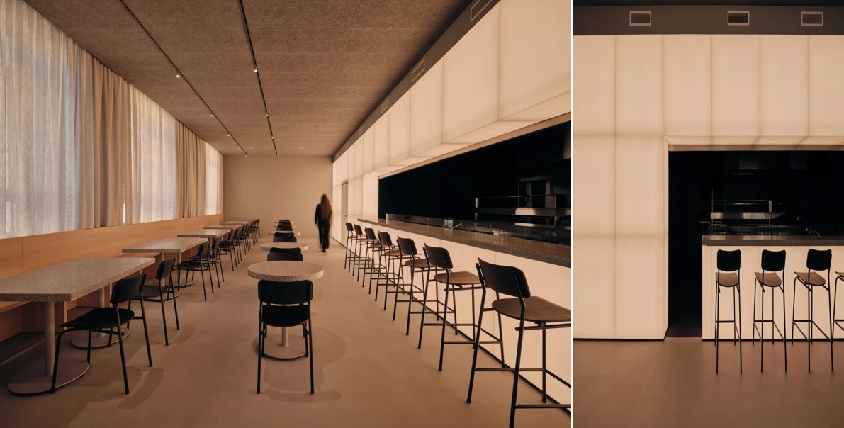 Huit Sushi餐廳的室內設計主角是一面可調整RGB光譜的客製化LED牆 。這面發光隔牆透過光線的色彩、節奏與材質的結合,可以創造出多感官的沉浸式療癒氛圍,透過「節律感」所產生的感知與反應,將以人為本的福祉設計概念引入日常商業零售空間,提升了用餐體驗的情緒基礎設施價值。