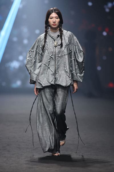 在都市與自然間穿梭,快與慢之間藏著創作的詩意。Liyu Tsai本季以「雙重節奏 Double Rhythm」為主題,描繪日與夜、理性與感性之間的靈感遷徙,並利用各種不同的荷葉細節,改變廓型,雕塑氛圍。