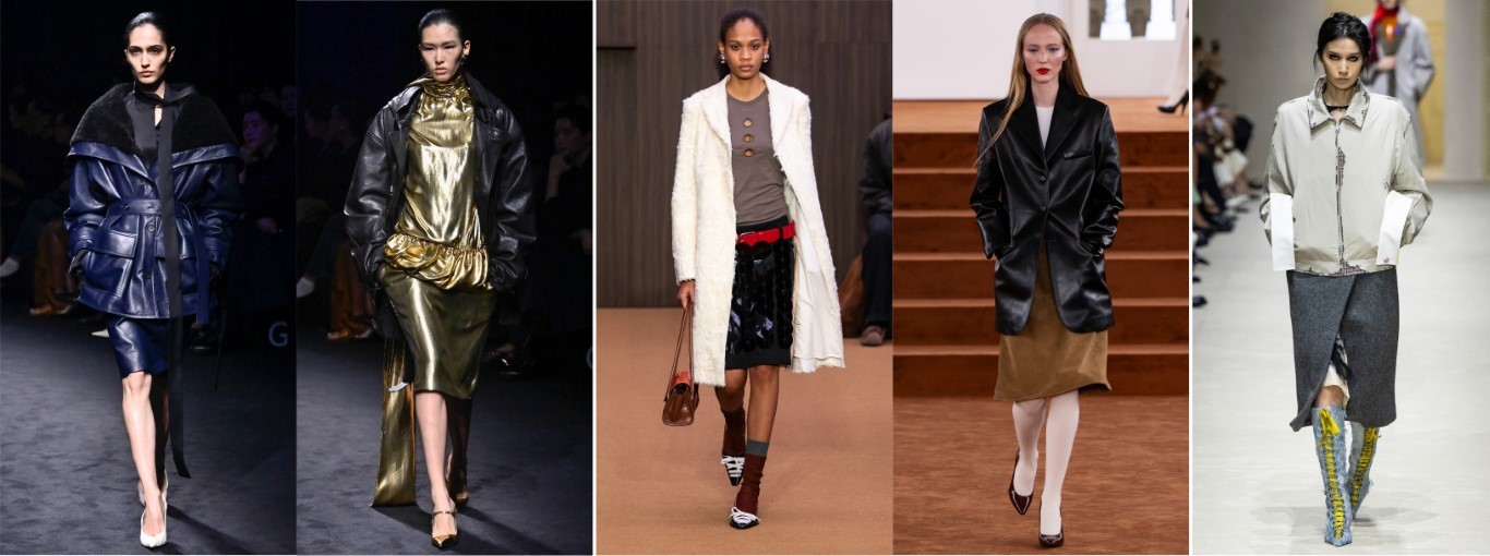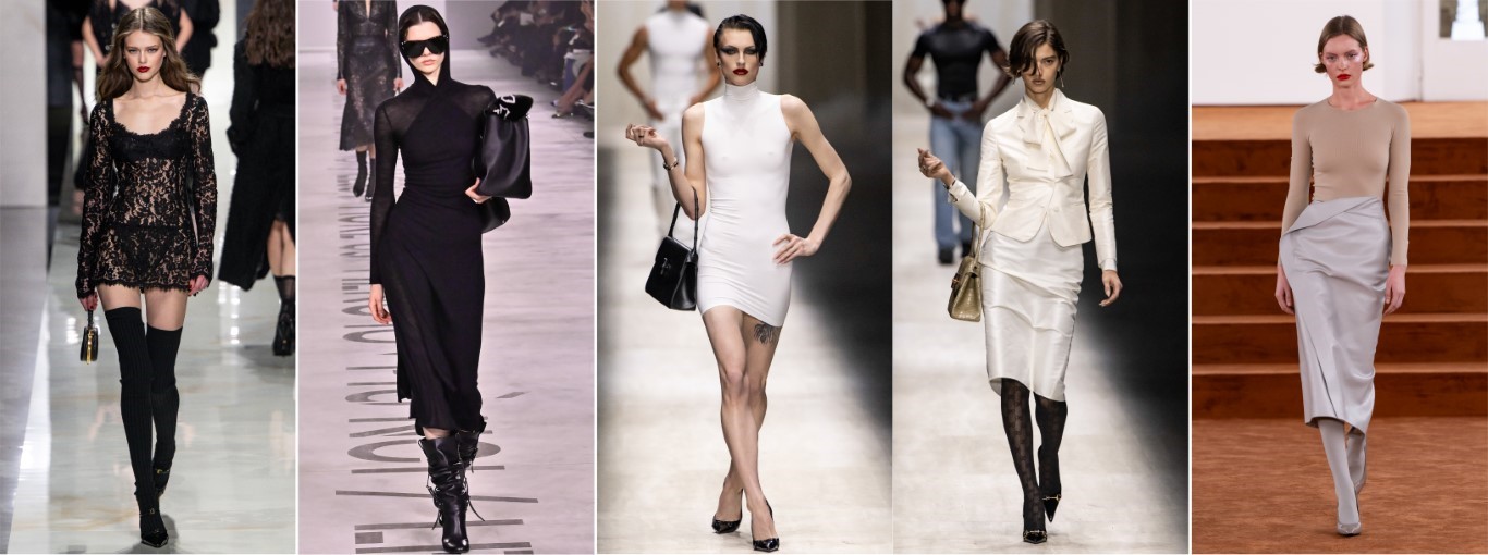 ˙貼身輪廓的流線美:伸展台出現了明顯的輪廓轉型,由Gucci與Dolce & Gabbana領軍推動了貼合身形的流暢曲線。此外,鉛筆裙的回歸也強化了優雅且從容的女性體態。
