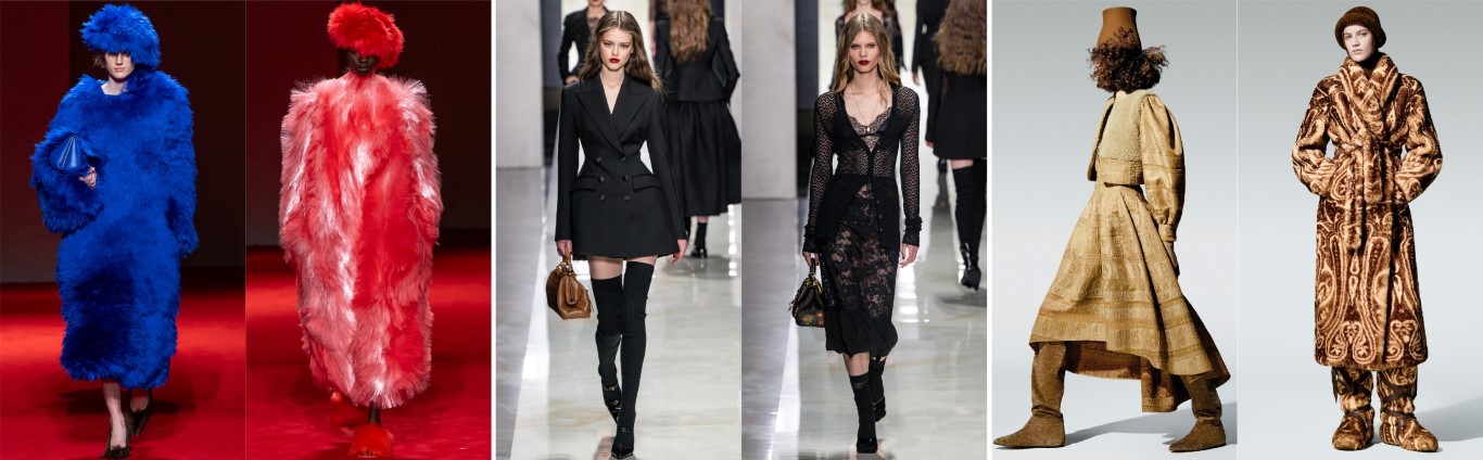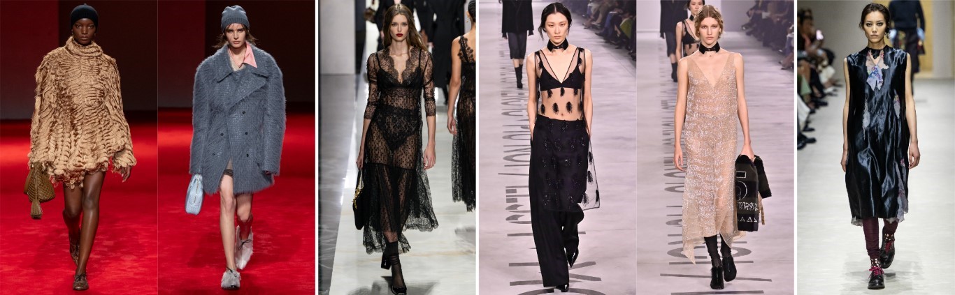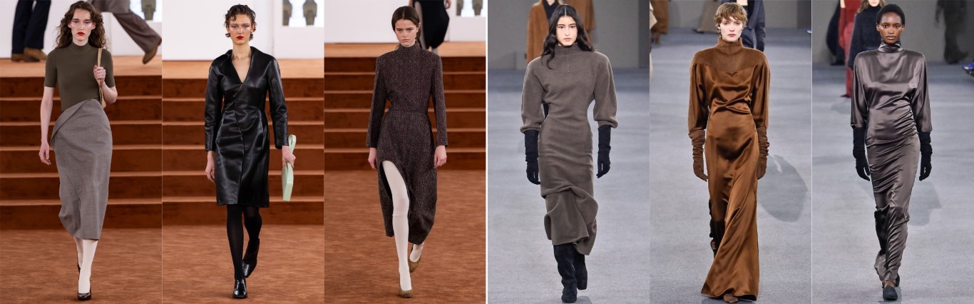 最愛品牌:Jil Sander、Prada、Loro Piana、Brunello Cucinelli。由左至右:Brunello Cucinelli / Jil Sander / Loro Piana / Prada巴黎春天百貨Printemps指出,皮革、皮草、羊絨的溫暖和品質是值得投資,也傳遞安全感。層疊穿搭,巧妙運用透明元素,營造出更深層的層次感。還有重新詮釋的極簡主義,如Jil Sander、Prada的作品。裙裝以各種形式、長度和質地出現,Marni、Prada、Gucci和Fendi都著重展現了女性的柔美氣質,重新定義了裙裝的百搭性。溫暖的大地色調至關重要,營造出安全舒適的感覺。與之形成鮮明對比的是,全黑造型和秀場則展現了一種更深層的視角,如同黑暗的一面鏡子,映照出全球能量的黑暗面。