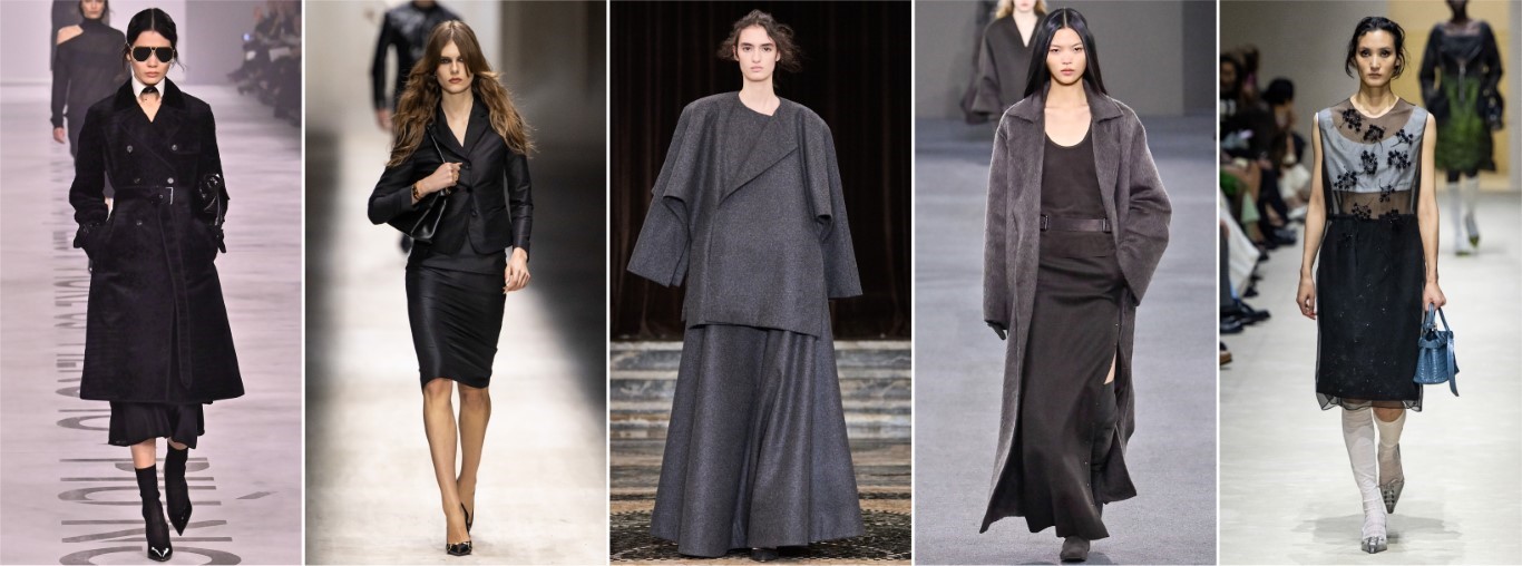 最愛品牌:Prada、Bottega Veneta、Jil Sander、Max Mara、以及新秀Institution by Galib Gassanoff。必備單品:Prada的透明刺繡裙與蟒蛇皮包;Max Mara或Fabiana Filippi的羊絨大衣;Gucci或Fendi的全黑造型 。由左至右:Fendi / Gucci / Institution by Galib Gassanoff / Max Mara / Prada義大利高檔連鎖百貨La Rinascente預測,黑色是本季最強勁的流行色。許多系列都推出了各種黑色單品,有些品牌甚至將黑色作為T台上的唯一顏色。並推薦Prada的疊穿設計、Dolce & Gabbana的性感魅力、Jil Sander的寬鬆廓形、Giorgio Armani的優雅氣質、Fendi的回歸本源、以及Bottega Veneta的精湛工藝。