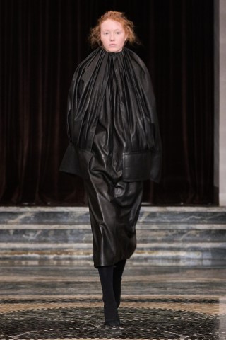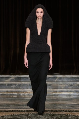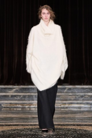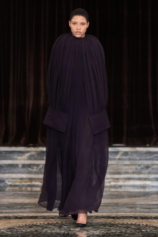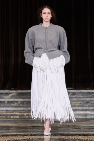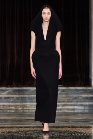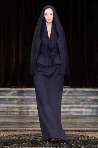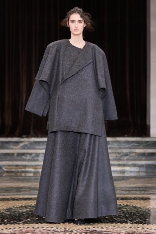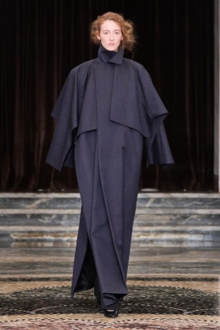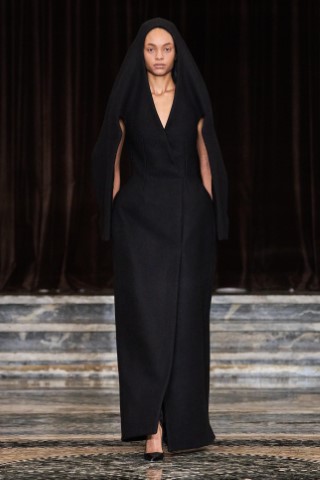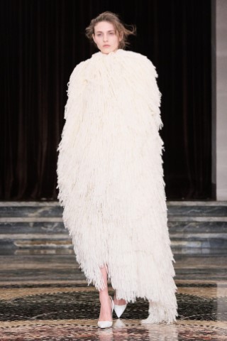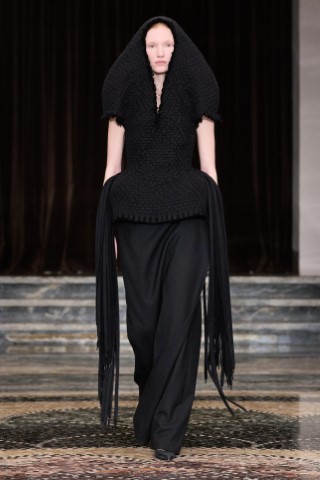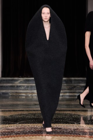 單品聚焦於具裙撐效果的長洋裝、聳肩短上衣及立體厚羊絨大衣,並巧妙將面紗解構成輕盈頭飾,或以流蘇斗篷展現剝離式的層次細節。
