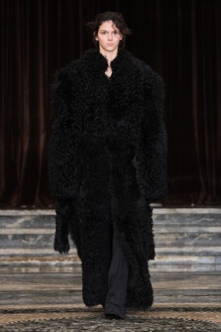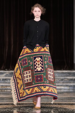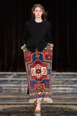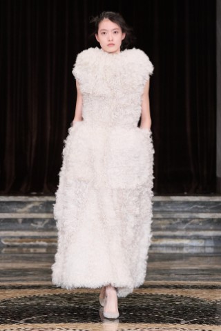 材質大膽實踐工藝轉化,將罕見的手工織造地毯技術織入裙裝,並以厚重氈製羊毛、羊羔毛與極輕薄的雪紡、緞面形成強烈的視覺對比。