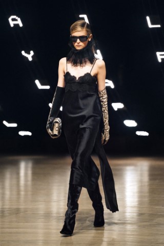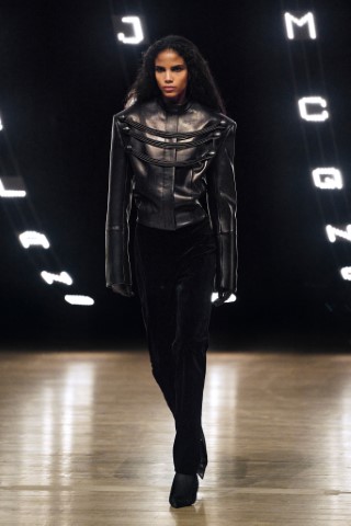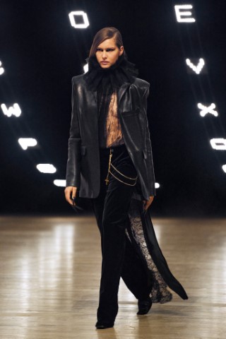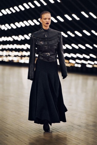 設計細節充滿建築感與顛覆性,錢夾鏈條貫穿服裝結構,搭配蕾絲貼花、皮革嵌飾與如同繪畫筆觸的手工刺繡,在裝飾與實用之間建立極致張力。