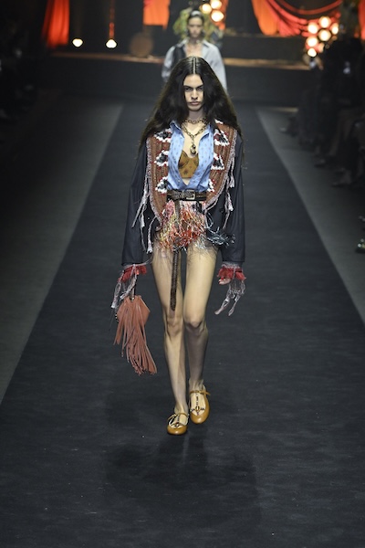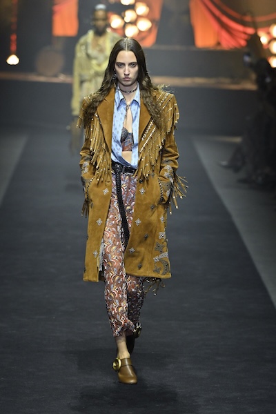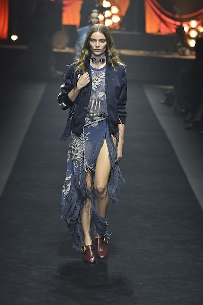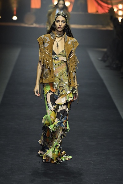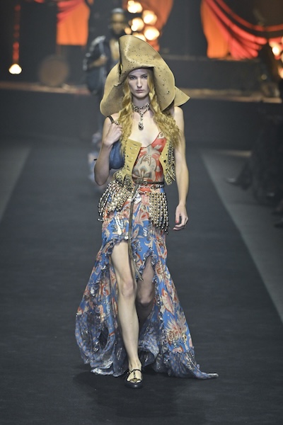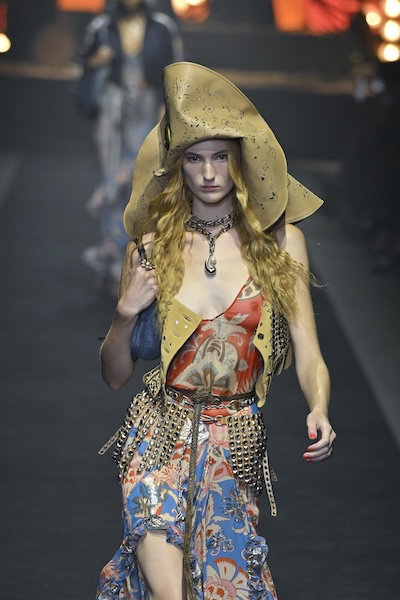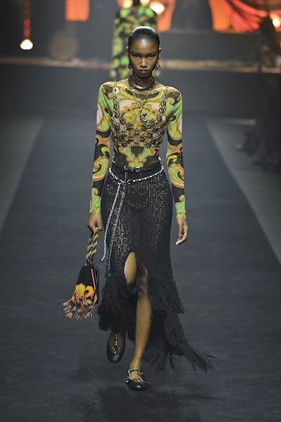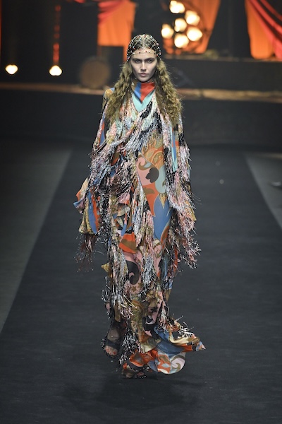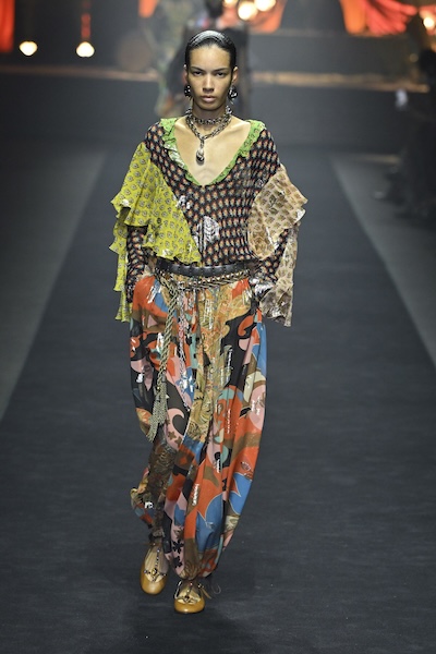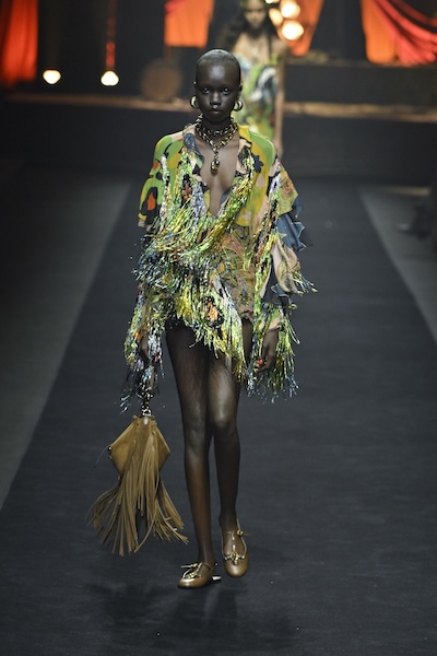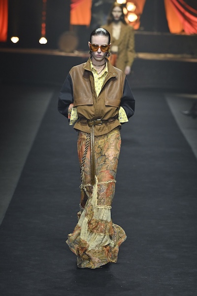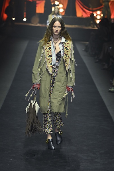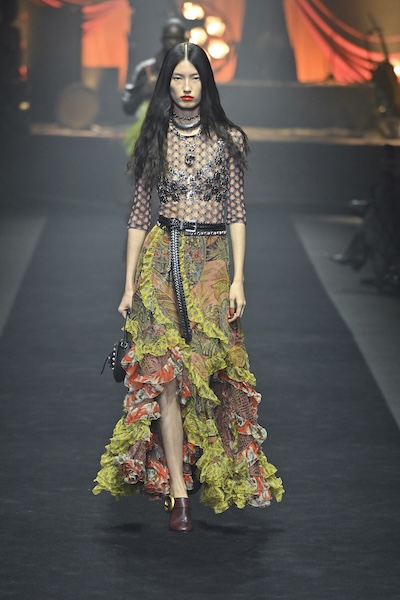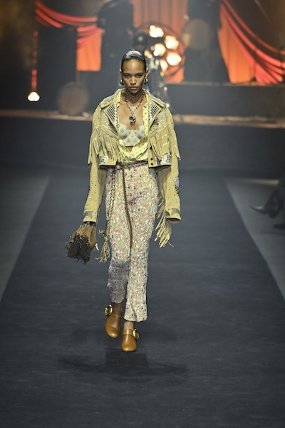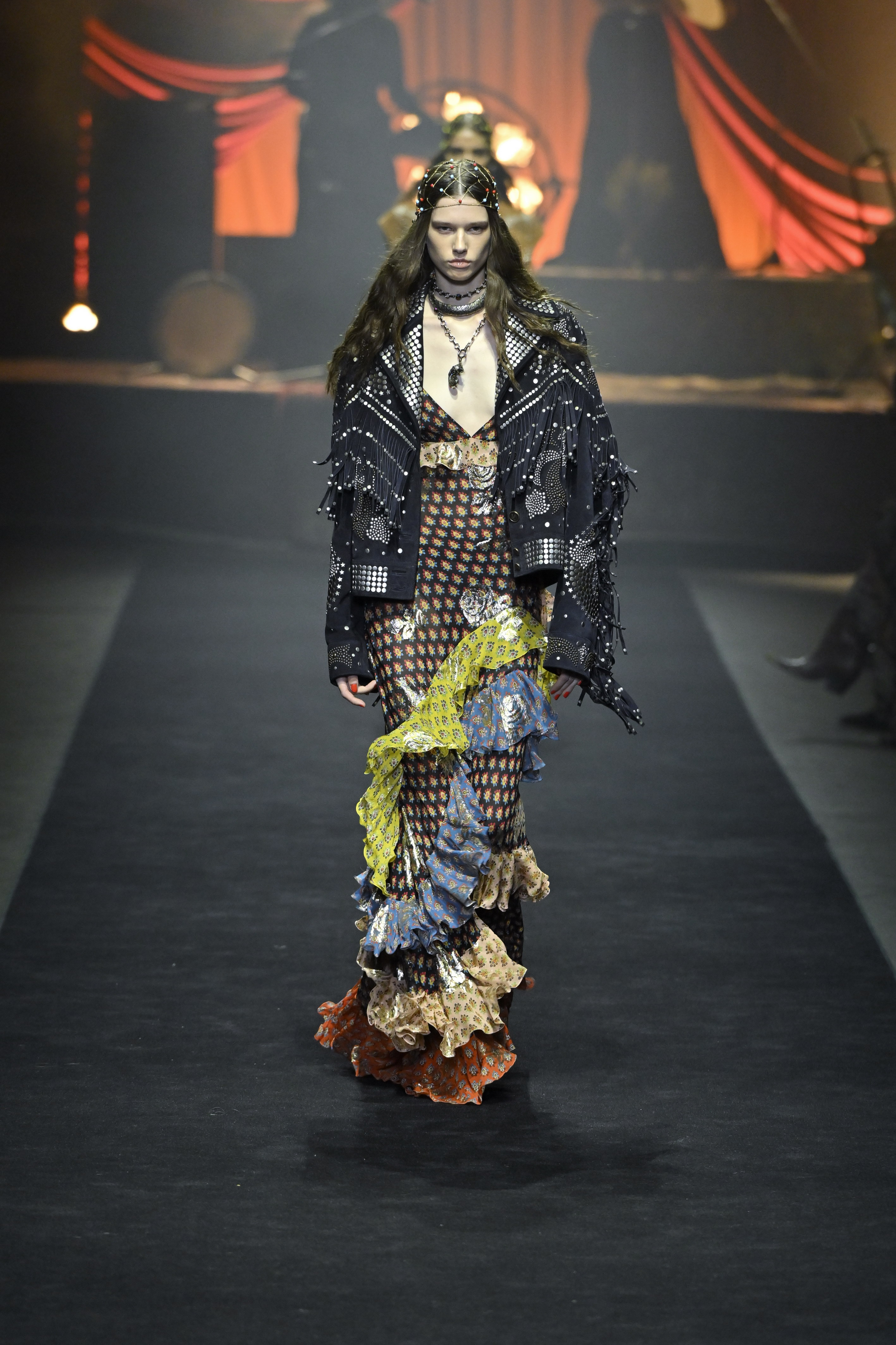 輪廓上可見輕盈而靈動的效果,飄逸的荷葉邊與流蘇隨動作舞動,透膚針織與細緻剪裁交錯融合。皮革機車外套與麂皮長外套上鑲嵌鉚釘流蘇,珠飾反射印花的節奏感,金屬提花、彩色嵌花與絢爛色塊相互碰撞,展現強烈視覺張力。