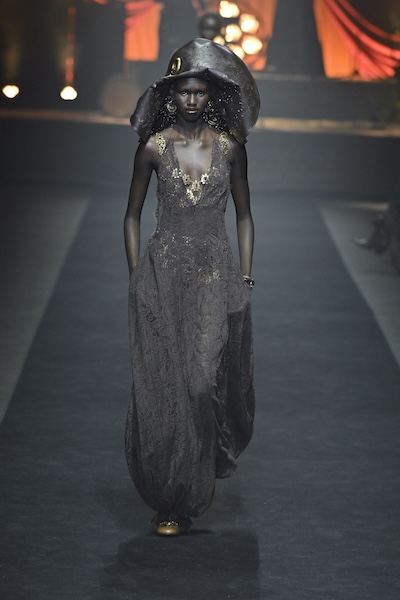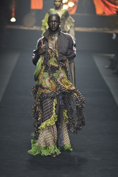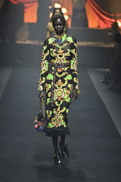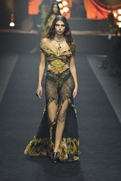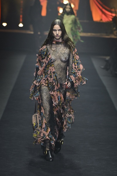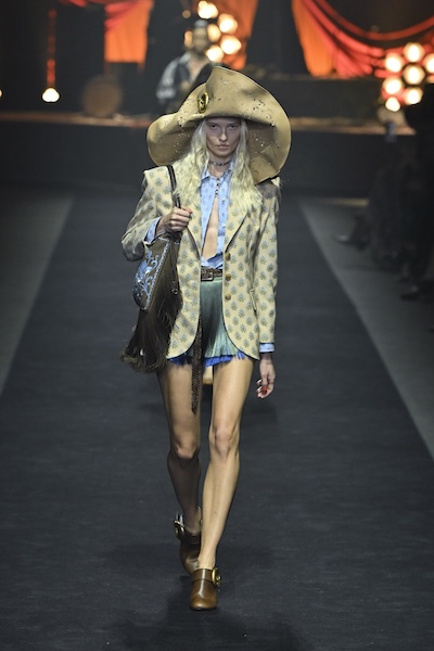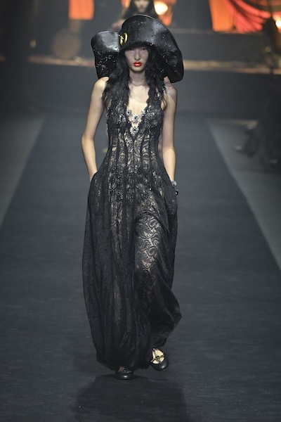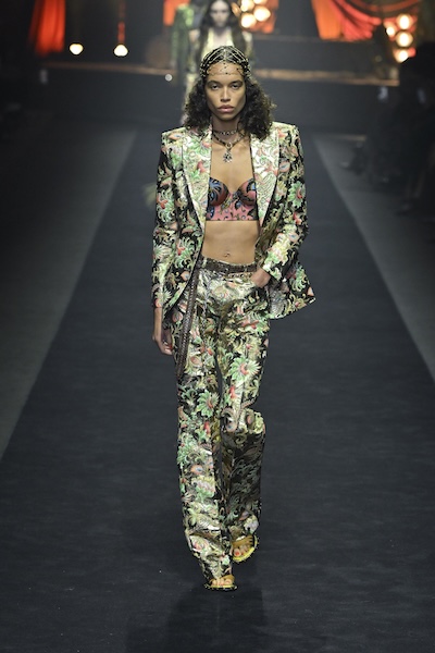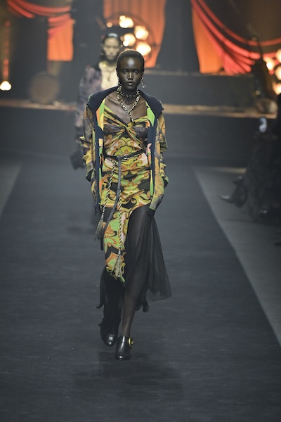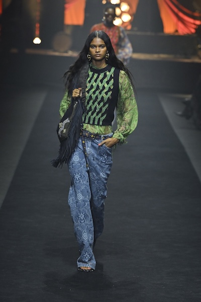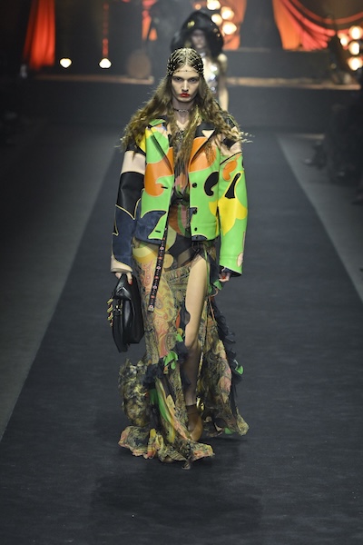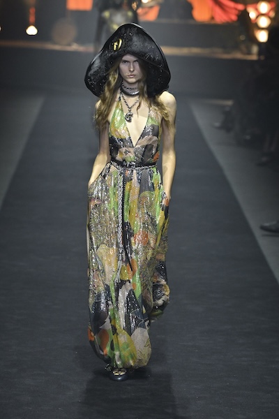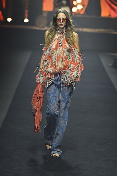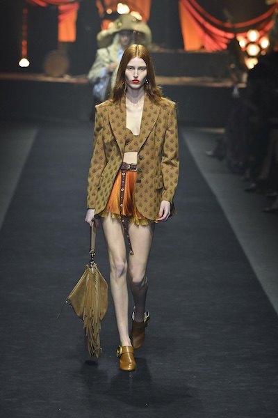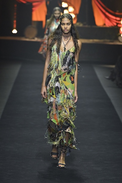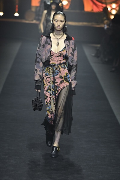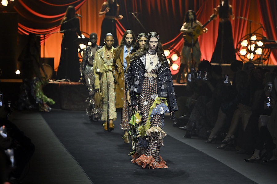 輪廓上可見輕盈而靈動的效果,飄逸的荷葉邊與流蘇隨動作舞動,透膚針織與細緻剪裁交錯融合。皮革機車外套與麂皮長外套上鑲嵌鉚釘流蘇,珠飾反射印花的節奏感,金屬提花、彩色嵌花與絢爛色塊相互碰撞,展現強烈視覺張力。