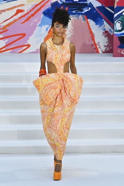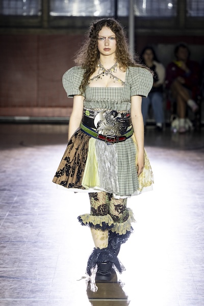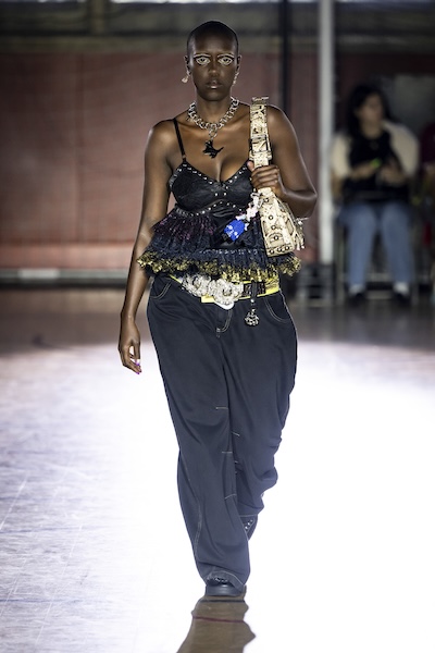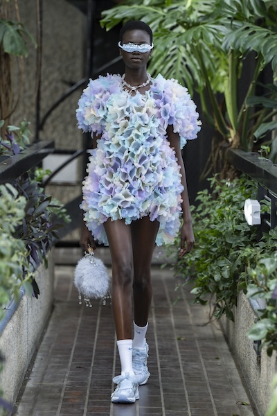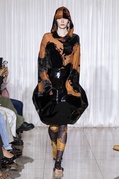 誇張的氣球裙擺如雕塑般的立體輪廓,特別是搭配收緊腰身,展現出強烈的戲劇張力與年輕的詭譎氣息。例如Sprayground 的金色馬賽克連身洋裝與 Paul Costelloe 的光澤圓點造型,皆以前衛手法演繹;Mithridate 則以氣球短裙搭配短版夾克,轉化為更實穿的日常造型,呼應市場對風格與機能並重的需求。