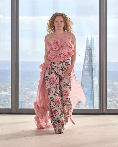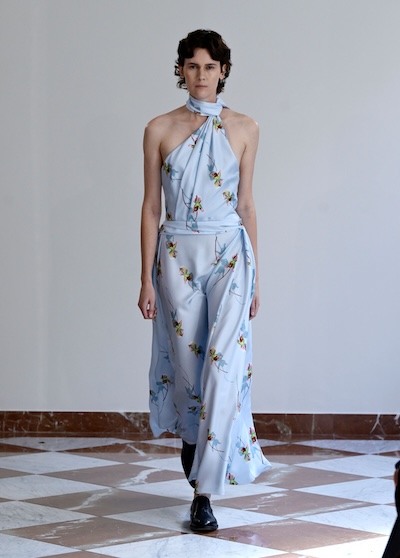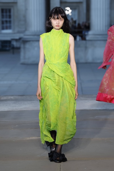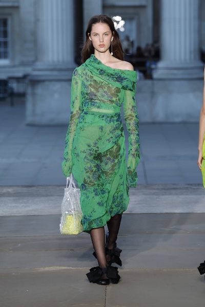 露背領口在倫敦也非常盛行,特別應用於輕薄洋裝上,削肩與露背設計成為都會女性展現自信與線條美的關鍵。Emilia Wickstead 與 Labrum London 的削肩繞頸洋裝,露出肩部與鎖骨,顯得俐落且優雅。