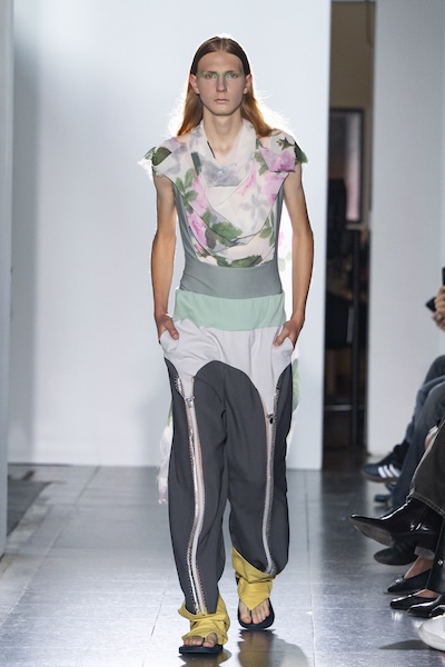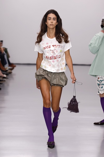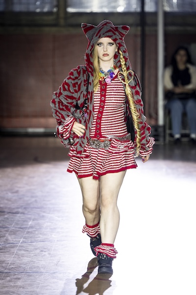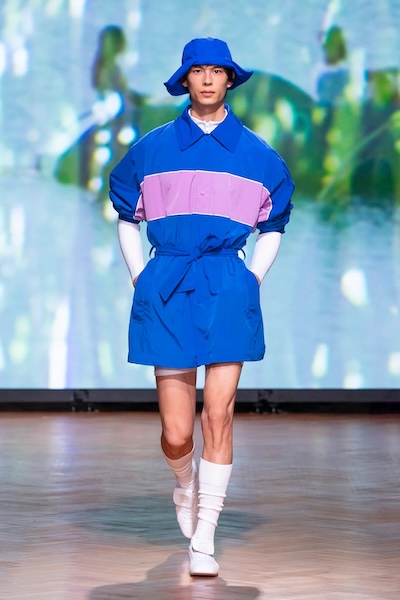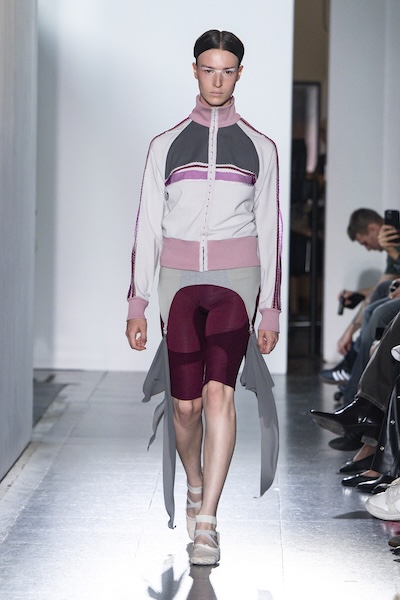 Louis Mayhew的高領運動外套及Kent & Curwen的條紋塊狀上衣,帶著濃厚復古運動風;Chopova Lowena 透過藍紅條紋的粗細對比,為造型注入俏麗與活力。
