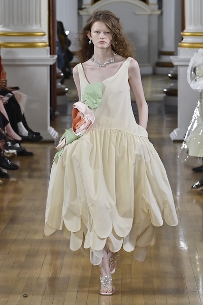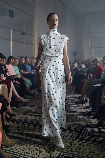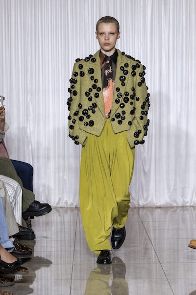這些圓點多用於局部拼接,例如Sinead Gorey、Susan Fang與Bora Aksu以點點薄紗疊合層次,增添造型的繁複精緻感;而Rory William Docherty則以立體圓球裝飾於西裝外套上,帶來充滿戲劇張力的趣味感。