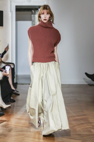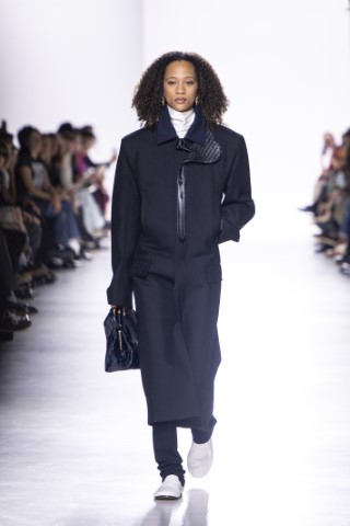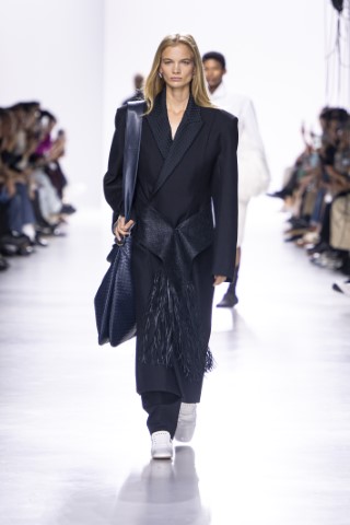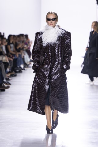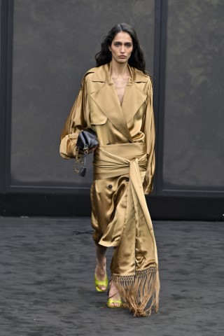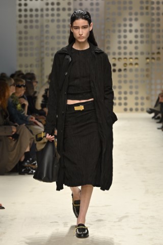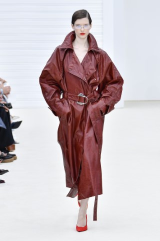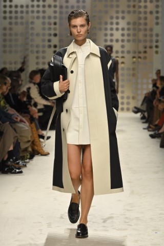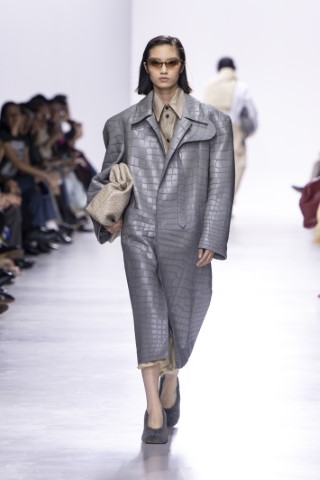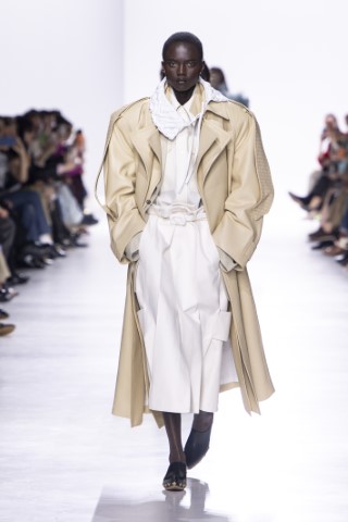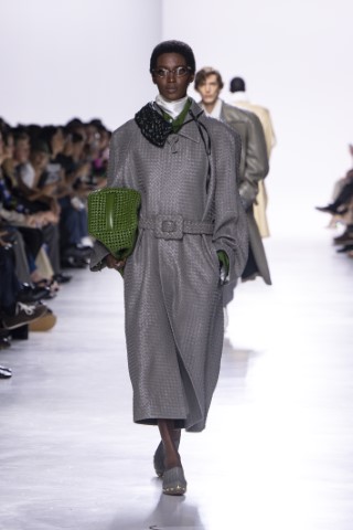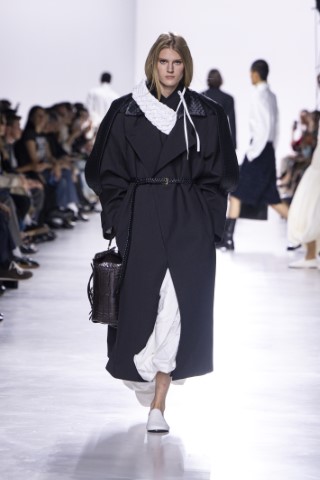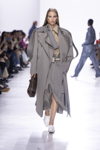 經典風衣在米蘭依然佔有一席之地,設計師以簡約輪廓為基礎,透過放大的領片、圓潤寬肩、與及小腿的長度,勾勒出大氣俐落的造型,如Bottega Veneta將品的編織皮革元素融入風衣的肩部線條中。