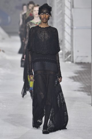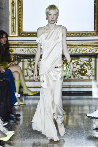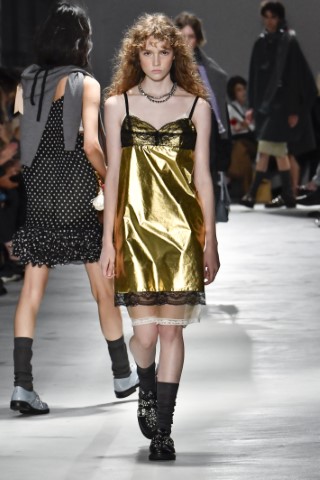 細肩帶真絲吊帶裙展現典型義式閨房性感,蕾絲與緞面拼接更添奢華質感。Dolce & Gabbana與Ferragamo是此風格的代表,以細膩工藝詮釋柔美與誘惑;N°21的金箔感洋裝搭配黑色蕾絲,則展現奢而不張揚的質感。