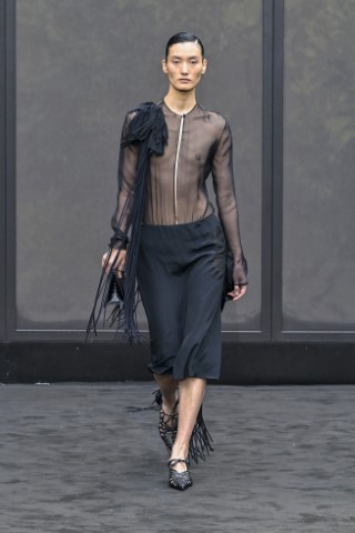 此外,輕透且帶光澤的面料是輕奢風格的首選,如The Attico的緞面鉛筆裙結合下擺拼接細節,Fendi的印花光澤裙則展現柔美質感;Max Mara與HUI的薄紗裙則透過層次堆疊,營造出若隱若現的層次感。