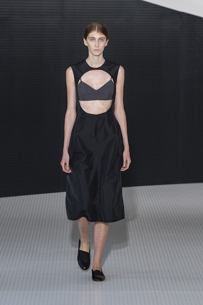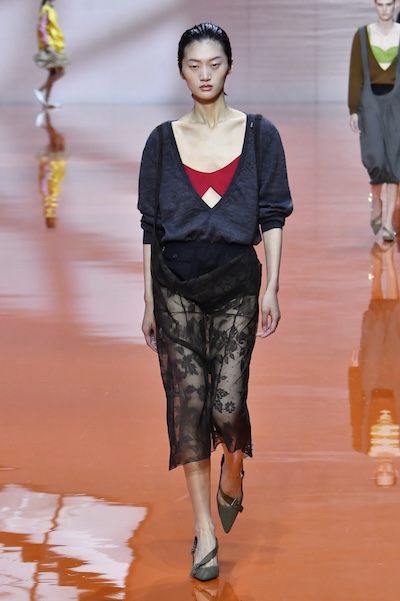 或是以非常規搭配、獨特配色玩味復古韻味,如Prada的蕾絲鉛筆裙搭配低領針織上衣,打破辦公室套裝的嚴肅印象,性感而不失俐落;Jil Sander的挖空洋裝則呈現大膽極簡線條。