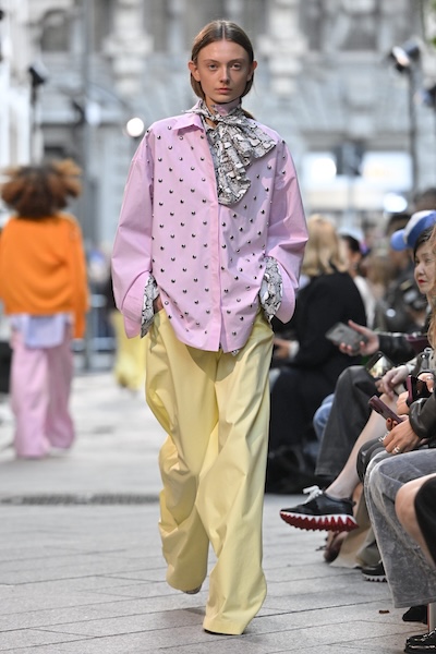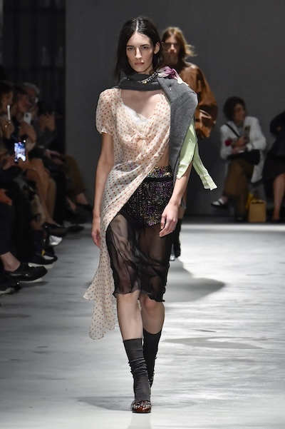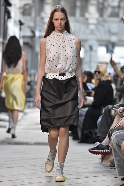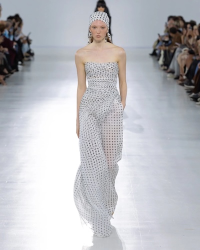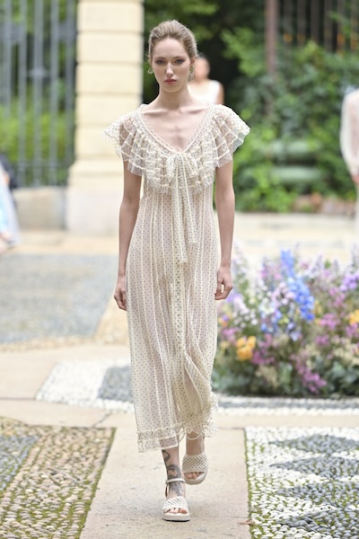 米蘭的圓點圖案輕盈俏皮,經典的黑白組合以輕量材質展現女性柔美氣質,如 Ermanno Scervino、Luisa Beccaria以全身點點搭配飄逸細節,營造出層層堆疊卻輕透的視覺效果。