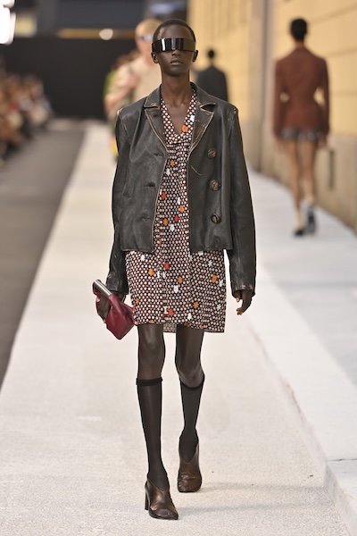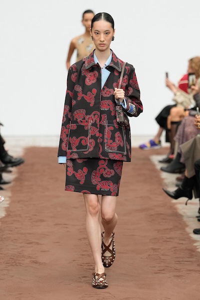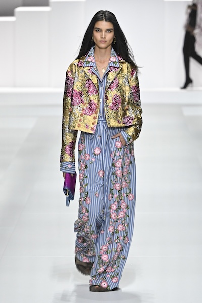 此外,不同印花單品的混搭也很考驗搭配功力。MSGM以印花大衣搭配條紋上衣與格紋短裙,Dolce & Gabbana則以金屬色印花夾克結合條紋連身褲,都透過單品的視覺比例分配,讓繁複中依然和諧有序。