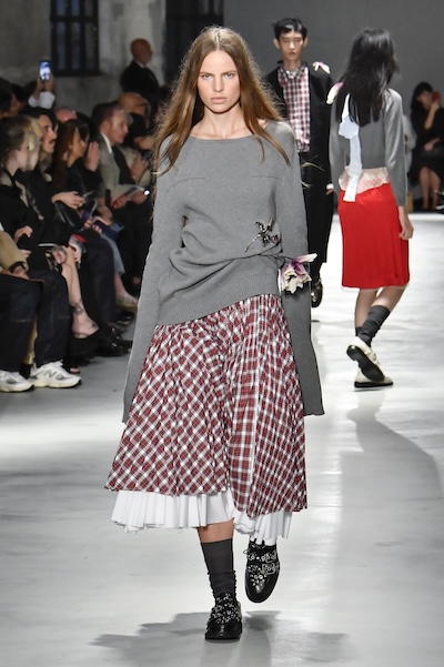 相對地,Moschino的綠色大格紋連身褲與N°21的紅色格紋裙,則以鮮明色彩搶佔視覺焦點,為造型注入活潑張力。