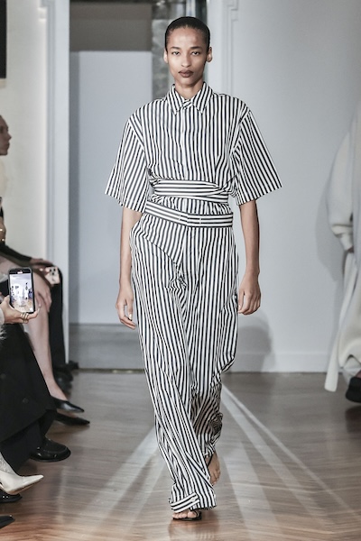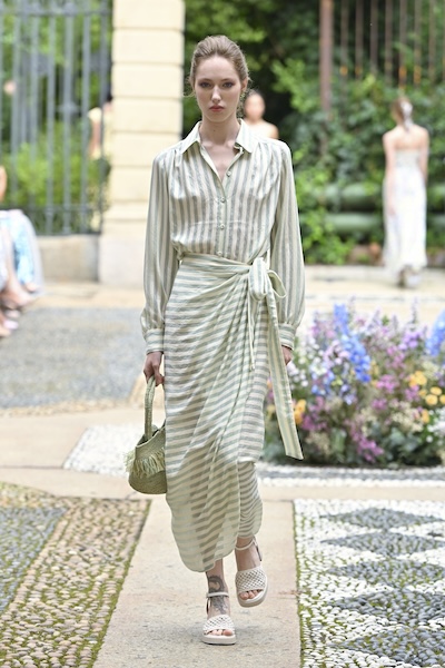 夏日條紋以白色交錯粉彩色線條展現清爽細緻,搭配襯衫式剪裁,重新定義休閒職場穿搭。如Luisa Beccaria 與Sa Su Phi的條紋連身套裝成功連接辦公室、居家與海灘場景,展現多場域的穿搭彈性。