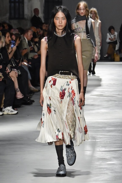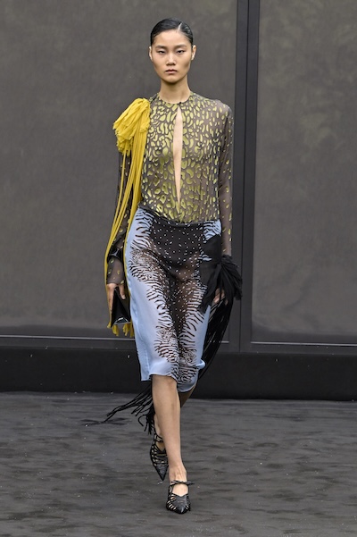 手繪般的花卉圖案彰顯藝術氣息,米蘭設計師尤擅以大尺寸鮮明花朵,展現浪漫且強烈的義式情懷。如N°21的花朵A開叉字裙與Sportmax的開叉長衫,皆以局部配置展現個性品味。Dolce & Gabbana與Sara Wong以亮片花卉呈現精緻細膩的風格。Etro、Dhruv Kapoor則透過誇張滿版印花與濃郁色彩,營造出充滿異國氛圍的視覺場景。