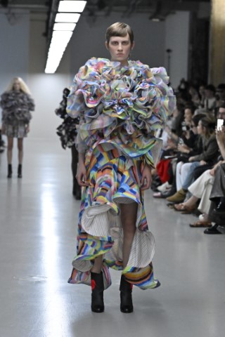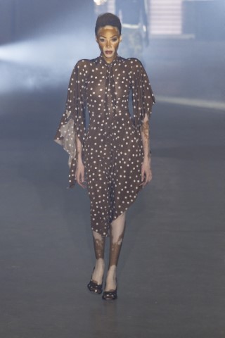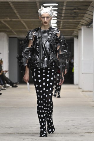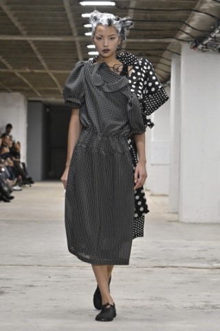 如Vêtements的飄逸圓點洋裝是最經典優雅的代表;Dries Van Noten以不同尺寸的黑白圓點搭配局部黑白色塊,營造復古又俏皮的氛圍;Maitrepierre則以圓形片狀裝飾與氣球輪廓結合,讓整體更加靈動。