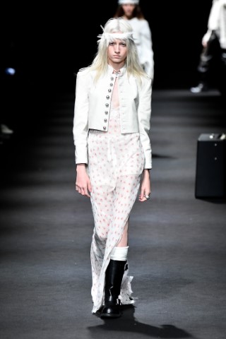 如Marie Adam Leenaerdt與Dior的洋裝設計皆富輕盈春意;Ann Demeulemeester的薄紗碎花洋裝搭配硬挺短版軍裝外套,則營造衝突又迷人的浪漫力量。
