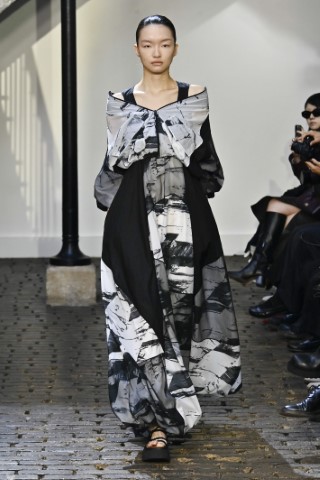 繪畫般灑脫的筆觸,為印花帶來更多自由與藝術性。暈染與潑灑的效果展現出隨性與實驗感。如AJE的彩繪套裝以粉彩色塊拼接,呈現充滿個性又俏皮的藝術氣息;Yohji Yamamoto的潑墨洋裝帶有日式禪意的極簡美。
