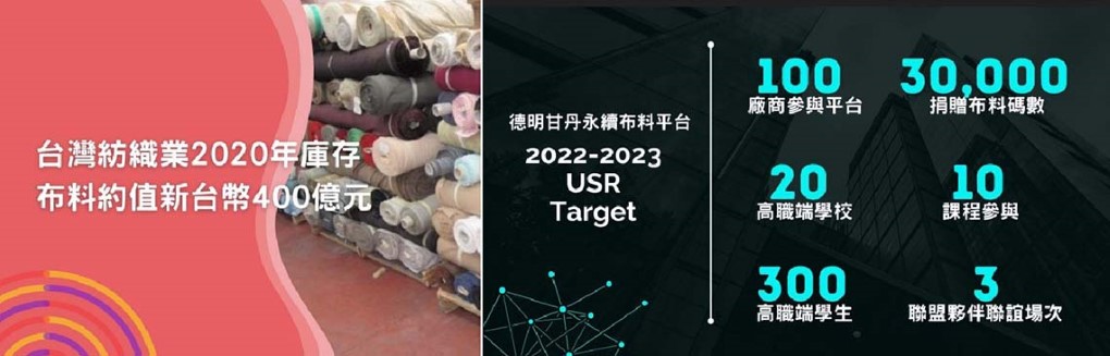 校方表示,台灣紡織業者積極投入餘布再生行列,德明甘丹永續布料平台在短短兩個月已有47家企業參與餘布捐贈行列,預計明年將達參與廠商100家以上,捐贈布料3萬碼,串聯20所高職端學校,學生超過300人次,助益10門以上設計相關課程。