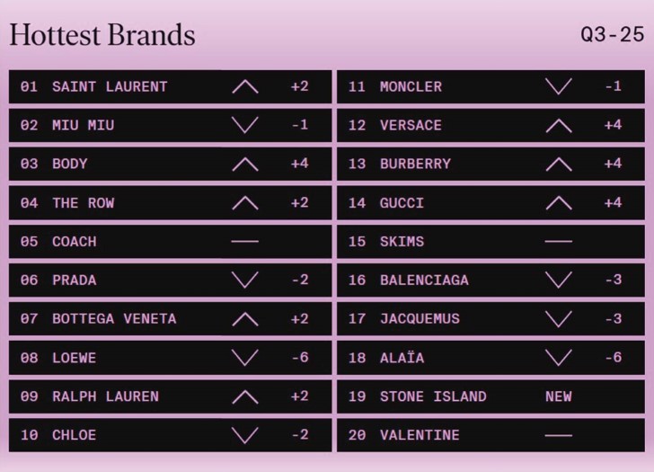 在多數品牌進行風格轉型與創意重整的同時,Saint Laurent憑藉一貫的俐落線條與性感輪廓,擊敗此前表現強勁的Miu Miu,首次登頂榜首。