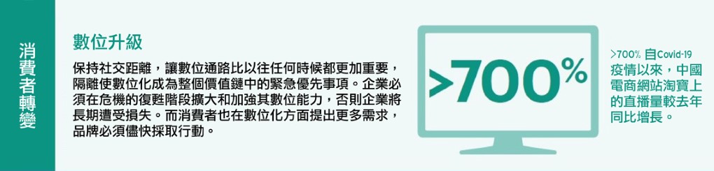 但在亞洲也出現了一線新希望。來自中國的證據表明,消費者越來越願意擁抱數位購物、數位娛樂和數位通信等解決方案,而這要歸功於品牌和零售商的快速反應,藉著啟動或改進創新通路,業者快速地提高了數位能力。