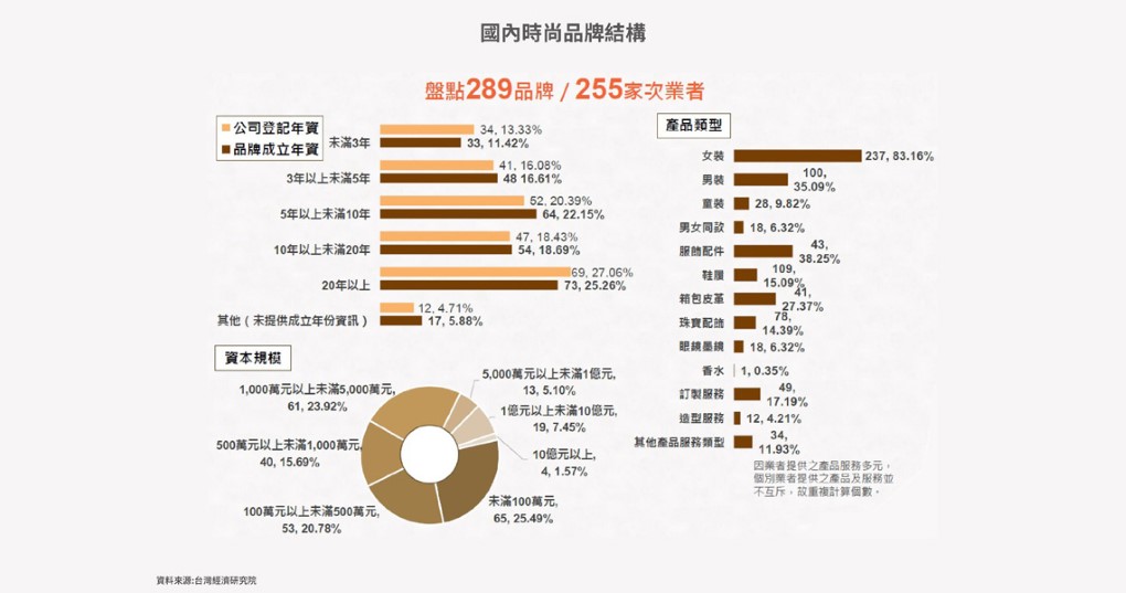 本次產業結構的調查盤點289家國內品牌,包含成立未滿3年至成立20年以上的品牌,產品類型以女裝居多。其中又以未滿100萬元的小資本品牌,與1,000萬以上未滿5,000萬資本規模者佔較大的比例,各約四分之一。