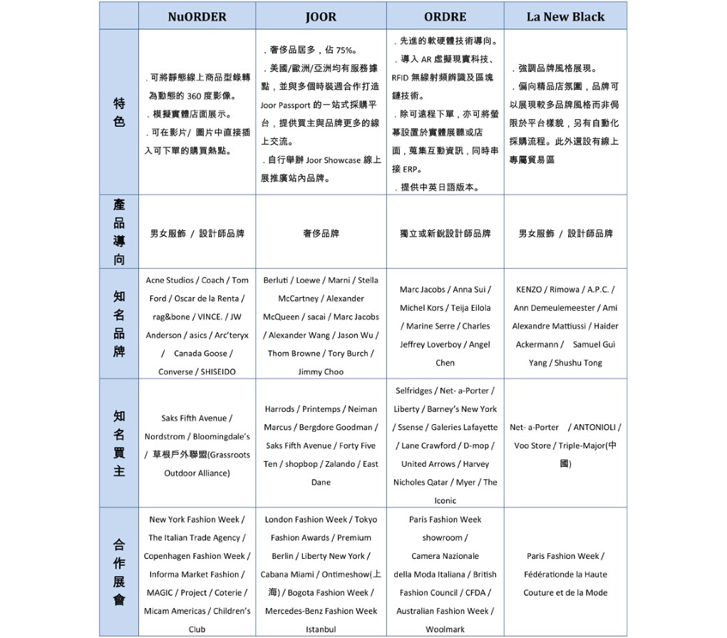綜合觀察以上平台,大部分都有提供包括從前期產品分類、線上款式展示單上傳,對中後期的訂單管理、資訊分析回饋、庫存管理等,也都有所涉略,不同的地方可能有些平台偏向技術如ERP/PLM、360度影像呈現、交易金流支援等。