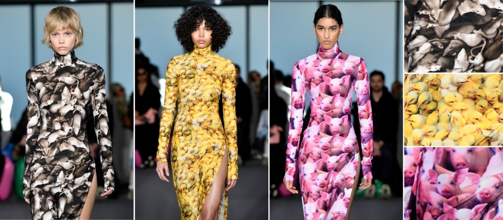而今年2月,我們就看到Christopher Kane在他的2023/24秋冬系列中,首次嘗試用AI創作動物印花,誕生出密密麻麻重疊的小雞、小豬和老鼠等超現實圖案。「你所做的就是對它說話,給出非常具體的描述,然後它就會想出這些東西。」Christopher Kane說。
