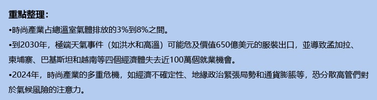 時尚供應鏈的長鏈結構,使它特別容易受到極端和不斷增加的氣候波動所影響。在2024年,整個行業需要轉變思維:氣候風險迫在眉睫,保持現狀不再是一種選項,企業應盡速建立氣候戰略。