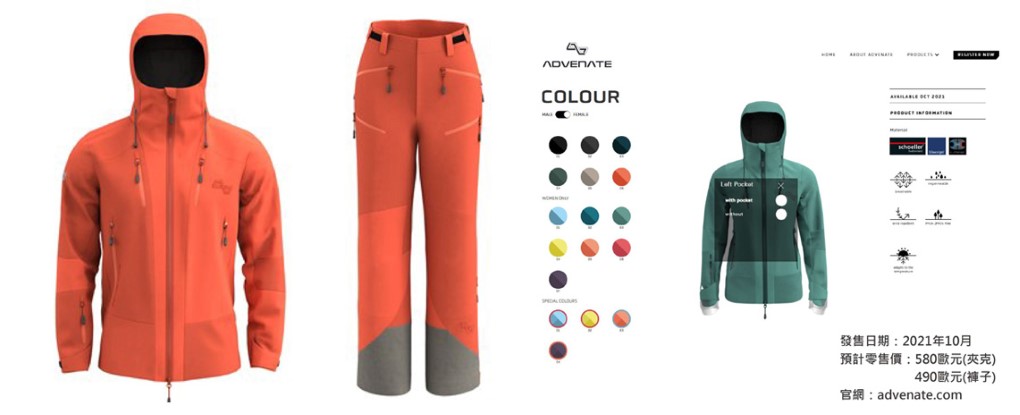 Advenate MyONE提供客製化,從顏色、口袋、袖長及服裝款鬆度都可以在線上選擇訂制的服裝產品細節,顏色除有不分男女的6個共用色,還根據男/女性別各提供11個專屬色,口袋可選擇左右邊是否需要保留或取消、袖長是否需要加長2cm、服裝需要寬鬆還是合身,以上都可以客製化訂購。