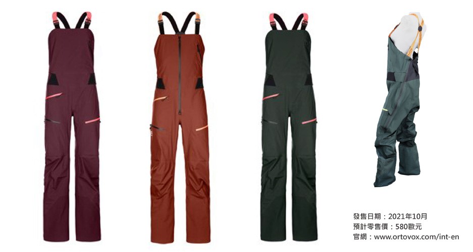 Ortovox的3L工作褲使用Dermizax® NX membrane (20,000毫米水柱) ,具有高防水、防風性和極佳的透濕性、輕量及柔軟,是嚴峻的氣候條件下進行戶外活動的理想材料,特別適合山岳越野滑雪,在褲腳處剪接高拉力及高強度Dyneema®纖維和Cordura的耐磨布料,為戶外冒險做好準備,將美麗諾羊毛布料當作襯裡設計於皮膚容易覺得寒冷的部位,吊帶及可調節的腰部可依照身形進行尺寸調整,四個口袋可收納隨身物品,雙向防水拉鍊具有方便穿脫及透氣功能。
