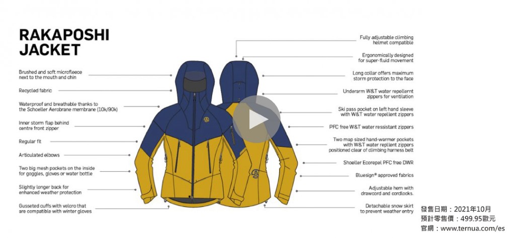 服裝細節上,設計了大容量的可調節立體帽型,可容納安全頭盔,多個儲物口袋可分類放置私人物品,袖口及下襬可調節防止風雨進入外套內,再加上安全RECCO救援系統的反光設計,兼具環保、機能與耐用。
