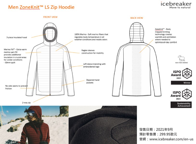 Icebreaker ZoneKnit連帽衫代表著一個品牌的承諾,該品牌希望在2023年變得完全無塑料,這款連帽衫象徵著循環經濟之旅,材料是完全可追溯的100%純天然美麗諾羊毛,來自大自然的產品,具有溫度調節和抗異味的特性,經過開發並通過無浪費的生產過程製成了可持續發展的連帽衫,正面填充美麗諾紗MerinoFill™提供額外的保暖,同時確保完全的活動自由,利用分區管理設計讓編織技術可實現織物的不同結構,並根據身體部位提供不同的通風或保暖區塊設計,最大目的在讓冬季運動愛好者保持溫暖和乾燥,是可持續性的中層代表產品。