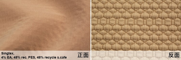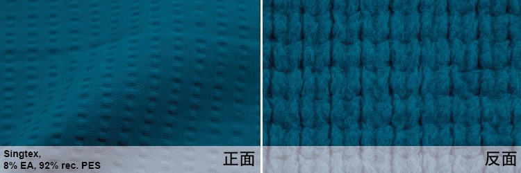 •STORMEGA™為興采公司(Singtex)的全新面料品牌,利用織物組織製造空氣層,並結合軟殼(Softshell),打造3D微氣候溫度調節單層梭織面料。如上圖,Singtex的這塊新面料由48%的回收聚酯、48%的S.Café回收聚酯和4%的彈性纖維製成。緊密的梭織結構具有耐用性和防水性,而且重量輕,還能調節體溫。在不使用刷毛的情況下,其3D空氣層可捕獲並且維持身體溫度,減少刷毛在洗滌過程中,掉落的微纖維流入海洋。