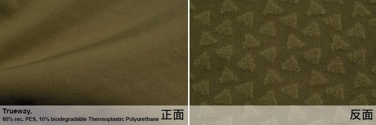 •智偉織造(Trueway)上圖布料成分80%回收聚酯與10%生物可分解熱塑性尼龍(TPU),強調從織物到膜都採用可生物降解原料製成,讓織物可以在合適的環境中緩慢分解,有效減少浪費。正面選用手感柔軟的面料,背面選用刷毛面料,手感好,保暖性好,圖案可訂製,重量為272gsm,耐水壓超過10000 mmH2O W/P (高速水壓法)和10000 g/sm*24hrs MVP (倒杯法)。