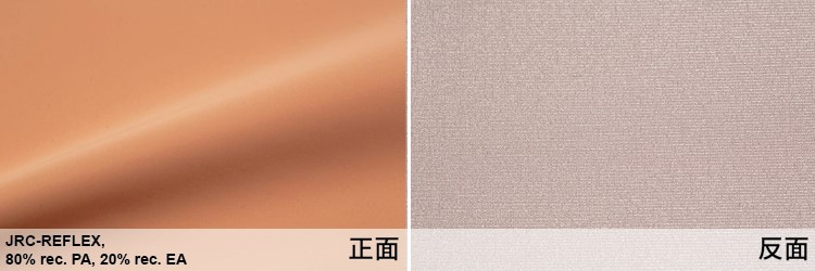 •JRC-REFLEX高能見度的再生彈力反光面料(成分:80% 再生尼龍/20% 再生彈性纖維),搭配新趨勢色彩又兼顧安全美觀,這塊反光織物係透過反射照射到布料表面的光線來發光,適用於任何休閒裝、運動裝、運動裝、時裝、鞋包及配飾等。