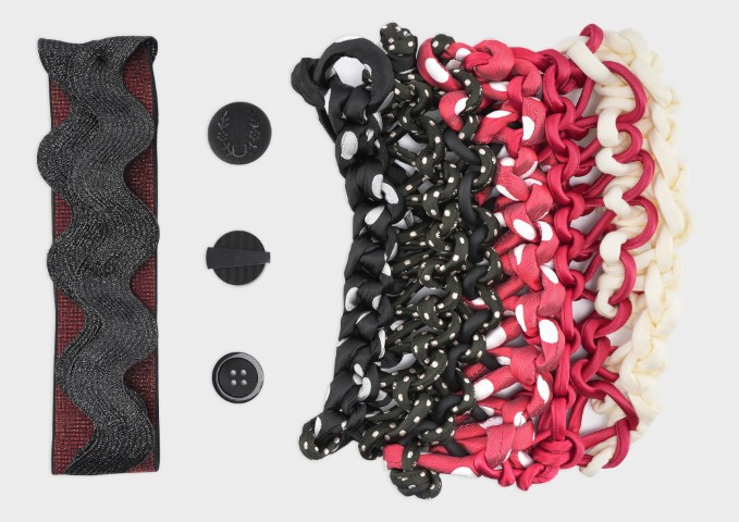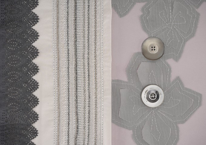 材質:包含彈力緞面、黑色微纖維、閃亮蕾絲、雷射切割細節、內襯薄網紗(lined tulle)、羅紋歐根紗、同色調提花布、虹彩尼龍以及流動感絲絨。