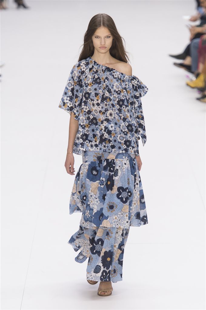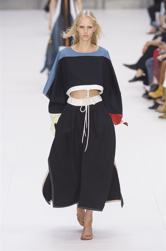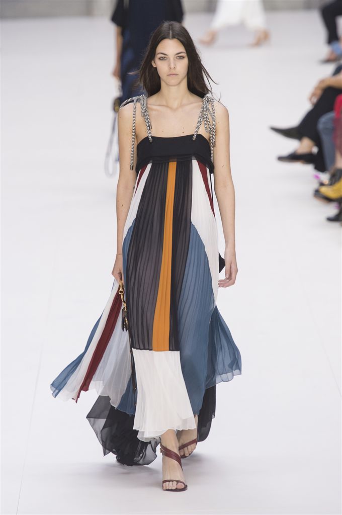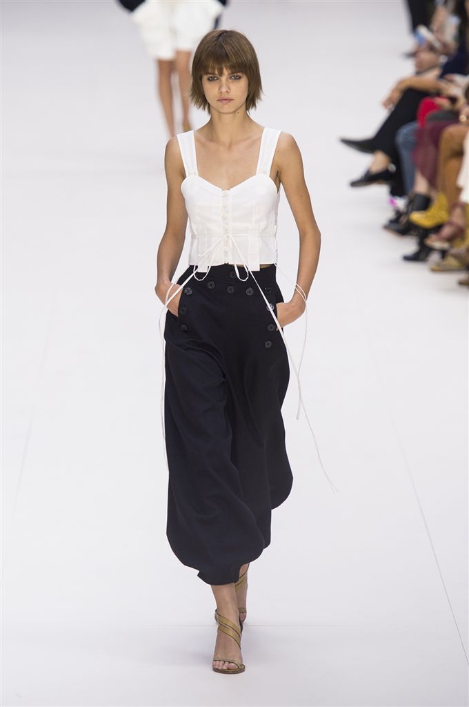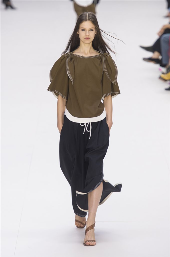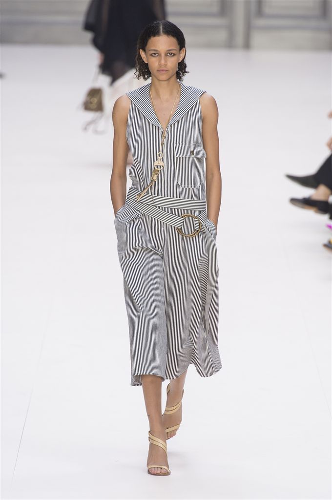設計師Clare Waight Keller深受“法式風格”影響,2017春夏融入了巴黎氣質、航海風、70年代印花等風格,無論是款式還是廓形,都充滿了法式印記,流暢自在。設計師以深藍、黑色、白色構成經典海軍色板,加入淺桃、芥末黃、棕色加以柔化,以及輕盈優雅的細百褶、飄逸靈動的荷葉、輕透的方形疊領、肩膀上的蝴蝶結、棉繩裝飾、貼花蕾絲等細節加以變化,尤以飄逸的百褶色塊雪紡洋裝、高腰球型長褲最為吸睛。