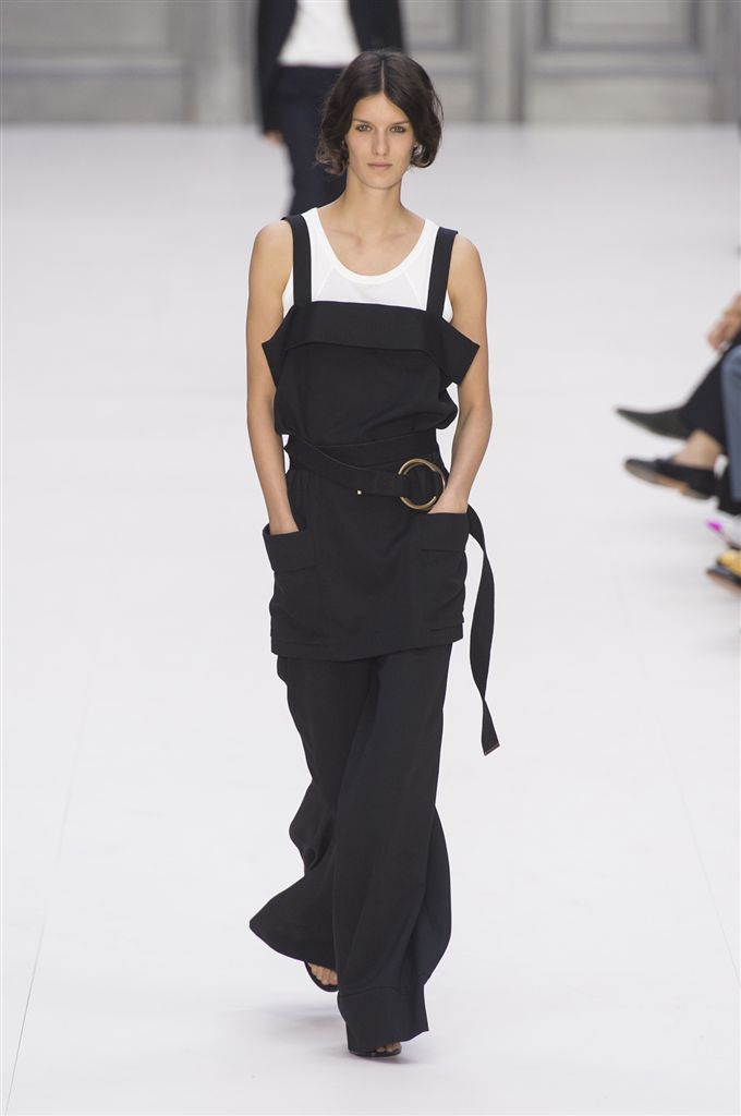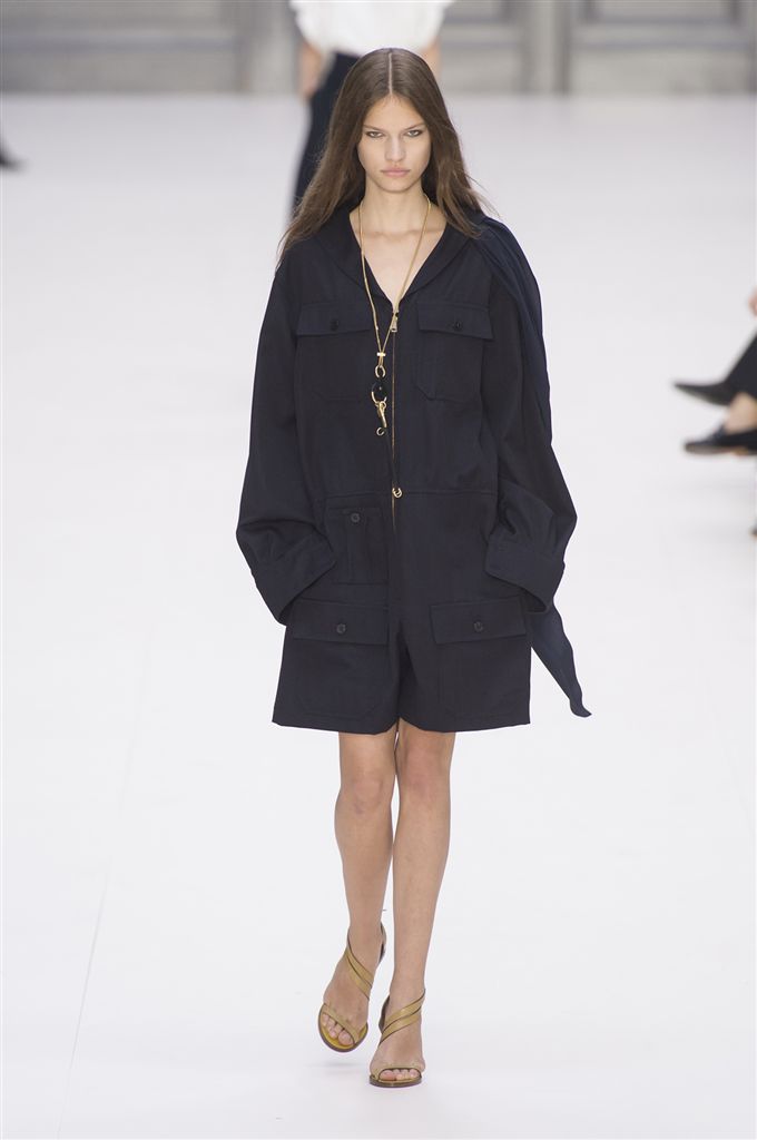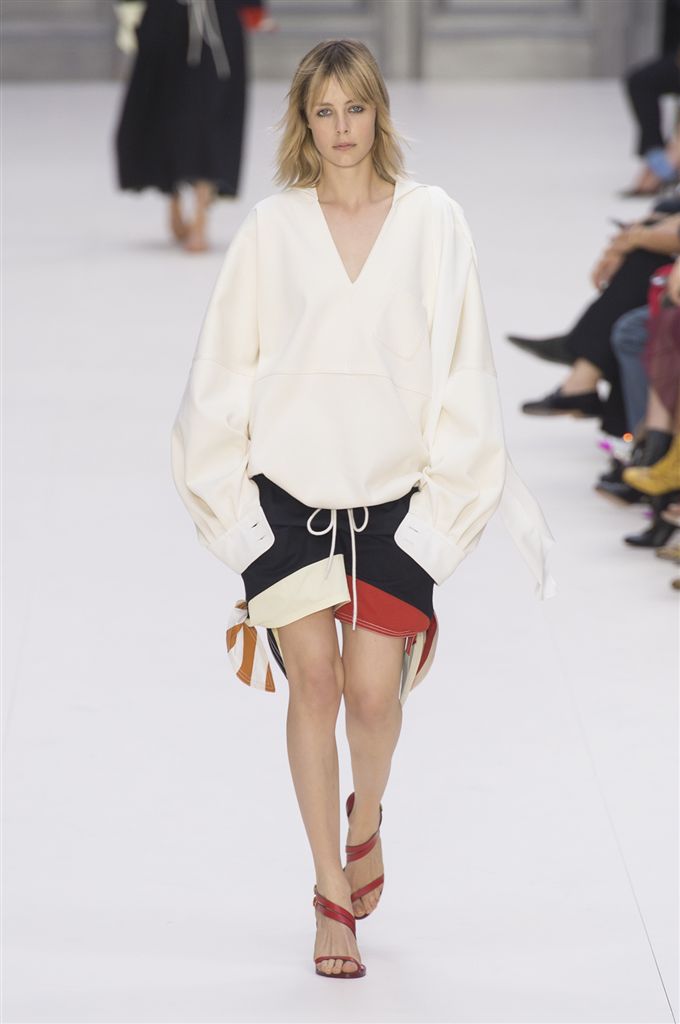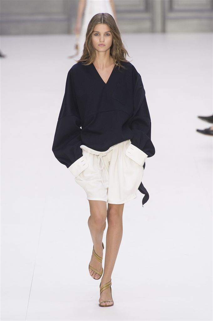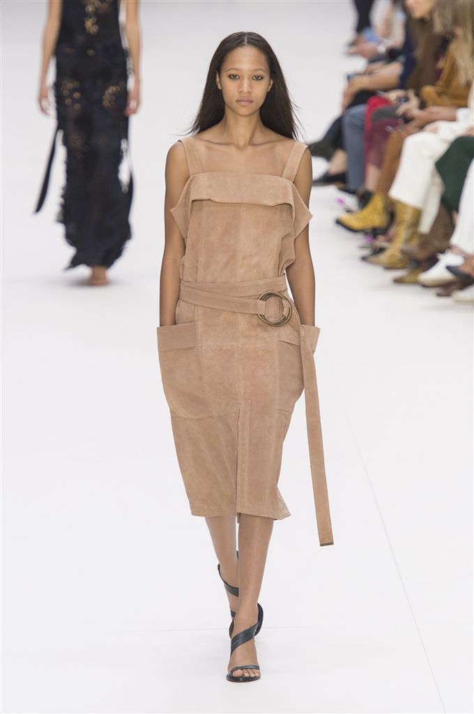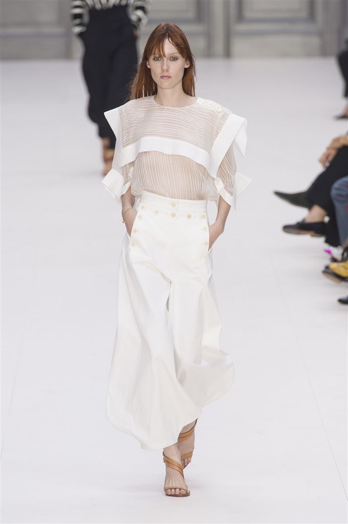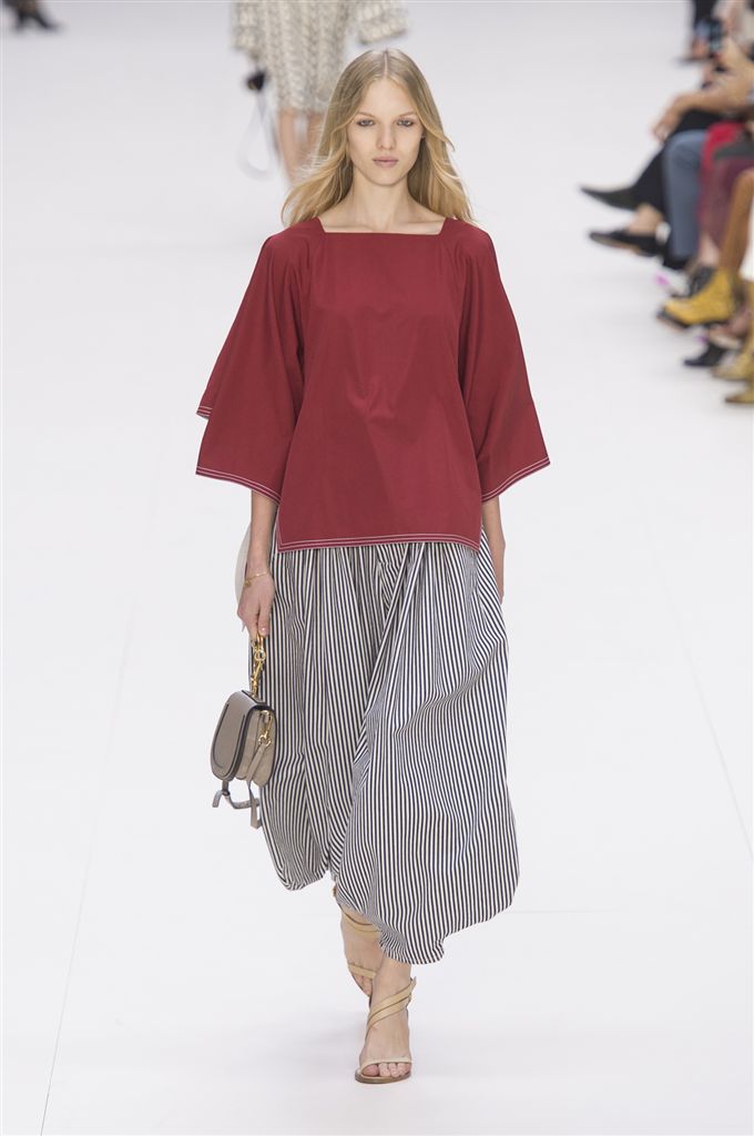 設計師Clare Waight Keller深受“法式風格”影響,2017春夏融入了巴黎氣質、航海風、70年代印花等風格,無論是款式還是廓形,都充滿了法式印記,流暢自在。設計師以深藍、黑色、白色構成經典海軍色板,加入淺桃、芥末黃、棕色加以柔化,以及輕盈優雅的細百褶、飄逸靈動的荷葉、輕透的方形疊領、肩膀上的蝴蝶結、棉繩裝飾、貼花蕾絲等細節加以變化,尤以飄逸的百褶色塊雪紡洋裝、高腰球型長褲最為吸睛。