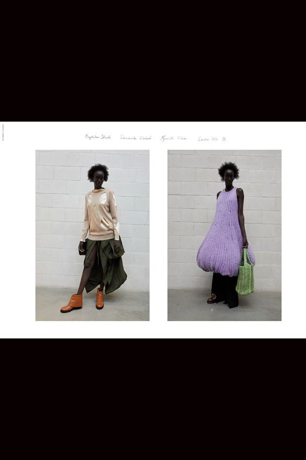 因此在這系列中能看到模仿了陶藝家Odundo作品陶瓷的曲線和顏色,如球莖針織連衣裙搭配閃閃發光的搖滾靴子;在服裝中的印花圖案,則是模仿表演藝術家Corbett的輪廓。設計師Anderson表示,在英國全面封閉的這一段時間中,他想做"更乾淨和更有策展力,偏重於輪廓的事情",這也是為甚麼在這一季,他再次以海報的形式來展現,發送給媒體、買家和消費者。