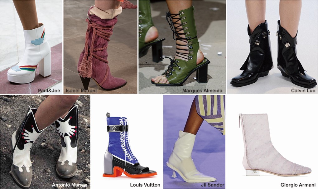 此外,弧頂的西部牛仔靴在2022春夏也是值得關注的單品 ,除了基本皮革或是皮革雕花的經典造型,也可以加入鉚釘/水鑽裝飾或撞色拼接設計。