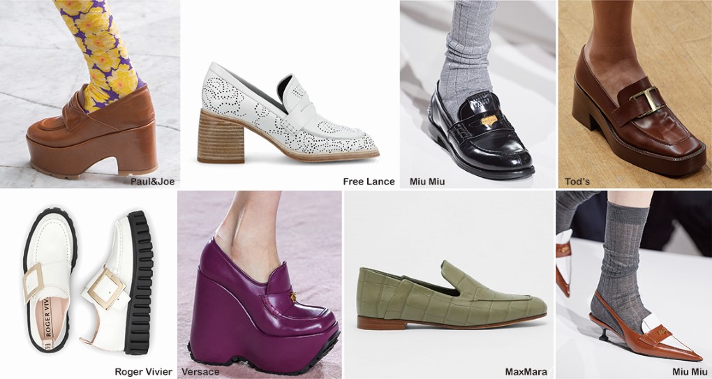 樂福鞋提供一個有別於一般圓/尖頭包鞋的選擇,成為可隨意搭配裙裝或褲裝的基本款。而在這幾季也看見樂福鞋款式的演變,逐漸變得厚實的鞋底十分受到年輕族群喜愛,在2022春夏以更誇張的粗高跟或是精緻的細跟更新其造型,另外像Miu Miu金色撞色尖頭樂福便相當時髦。